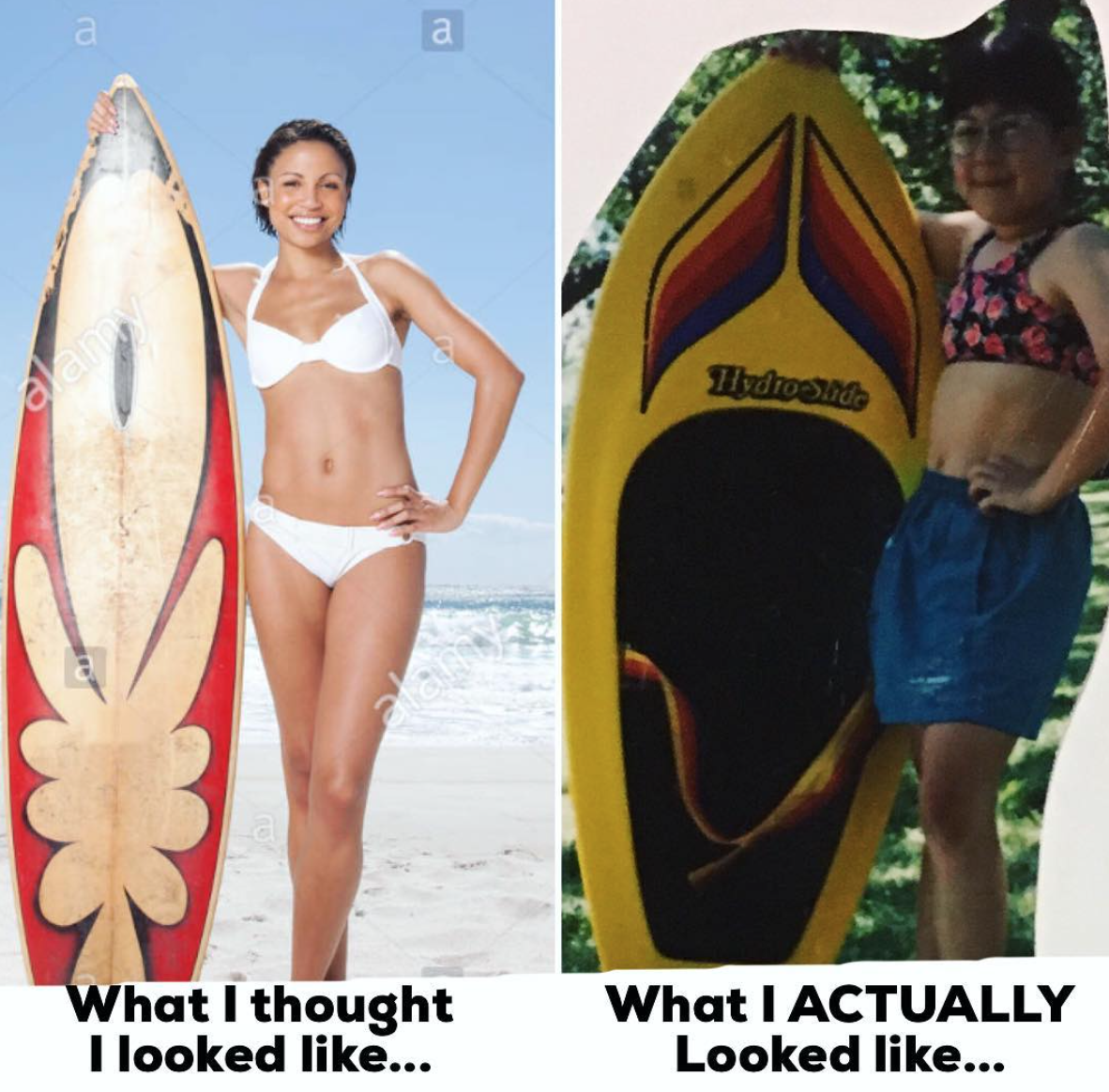 They can be BRUTAL, and when I hit the big time, I don’t want this photo of me popping up with the headline: “woman who says her body doesn’t define her- caught posing IN A BIKINI with a knee board thinking it was a surf board in 3rd grade!”