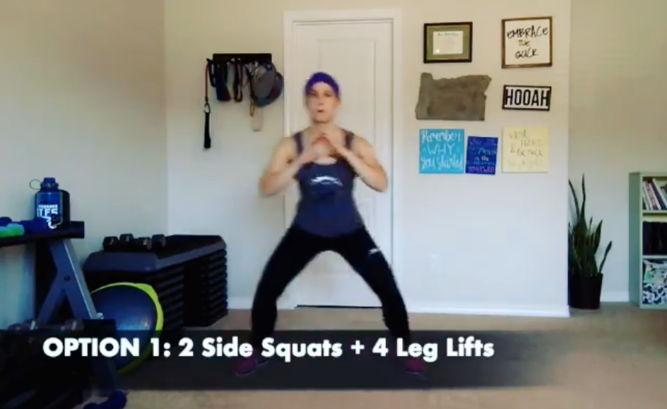 Progress or modify the side squat by focusing on the DEPTH of the squat (knees always facing toes, knees never pass toes on the decent)